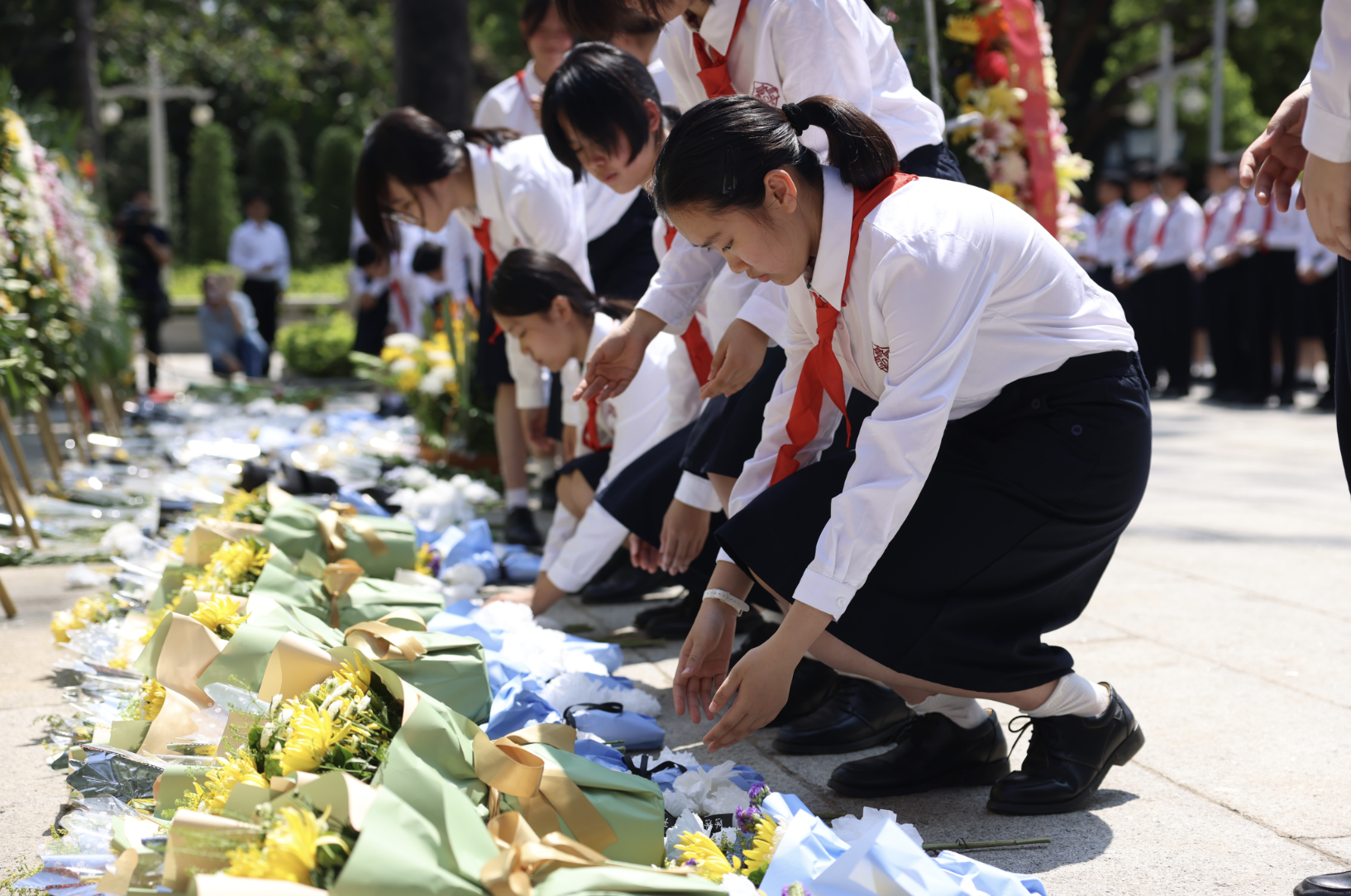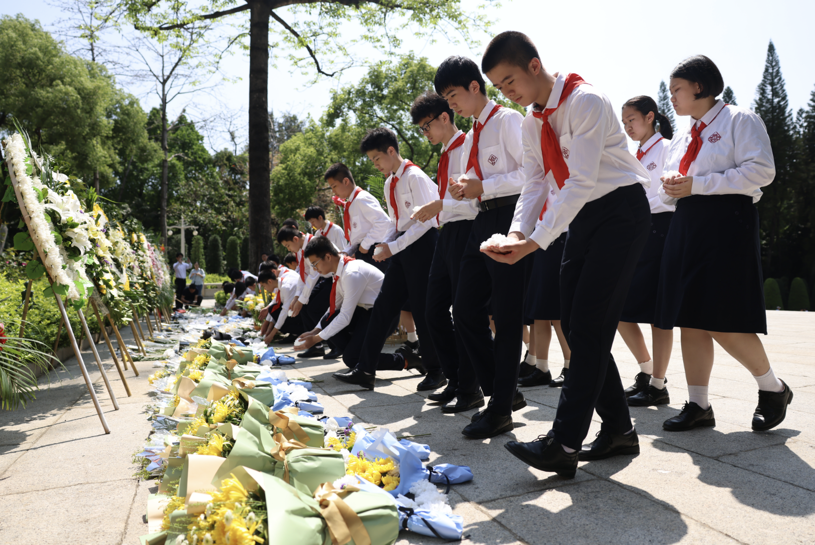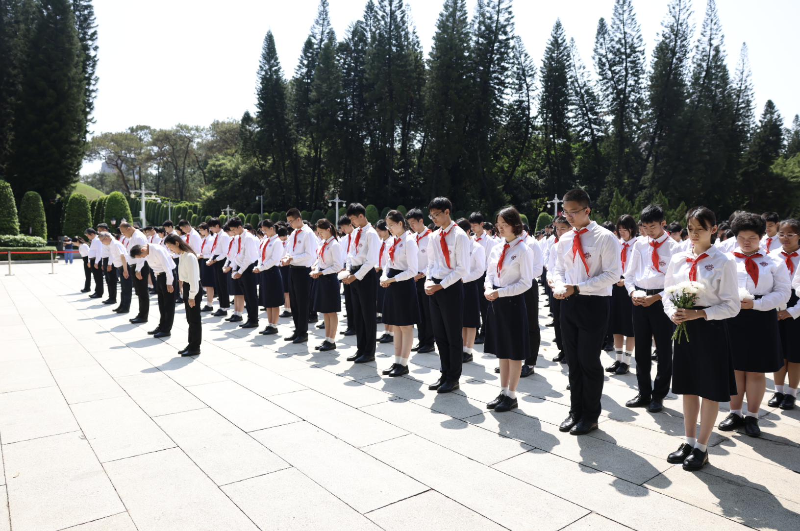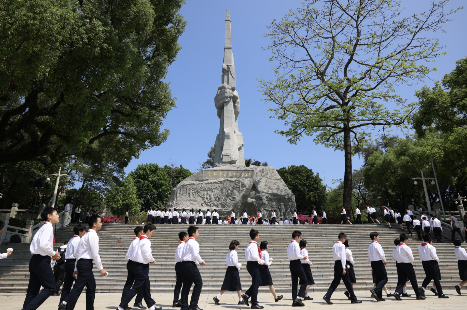 随后,来自广州市执信中学、越秀区东川路小学的学生代表依序上前,将手中承载着敬意的小白花摆放在纪念碑前,现场全体人员绕行瞻仰纪念碑,表达对革命先烈的无限敬意。
