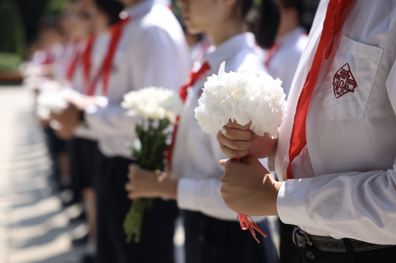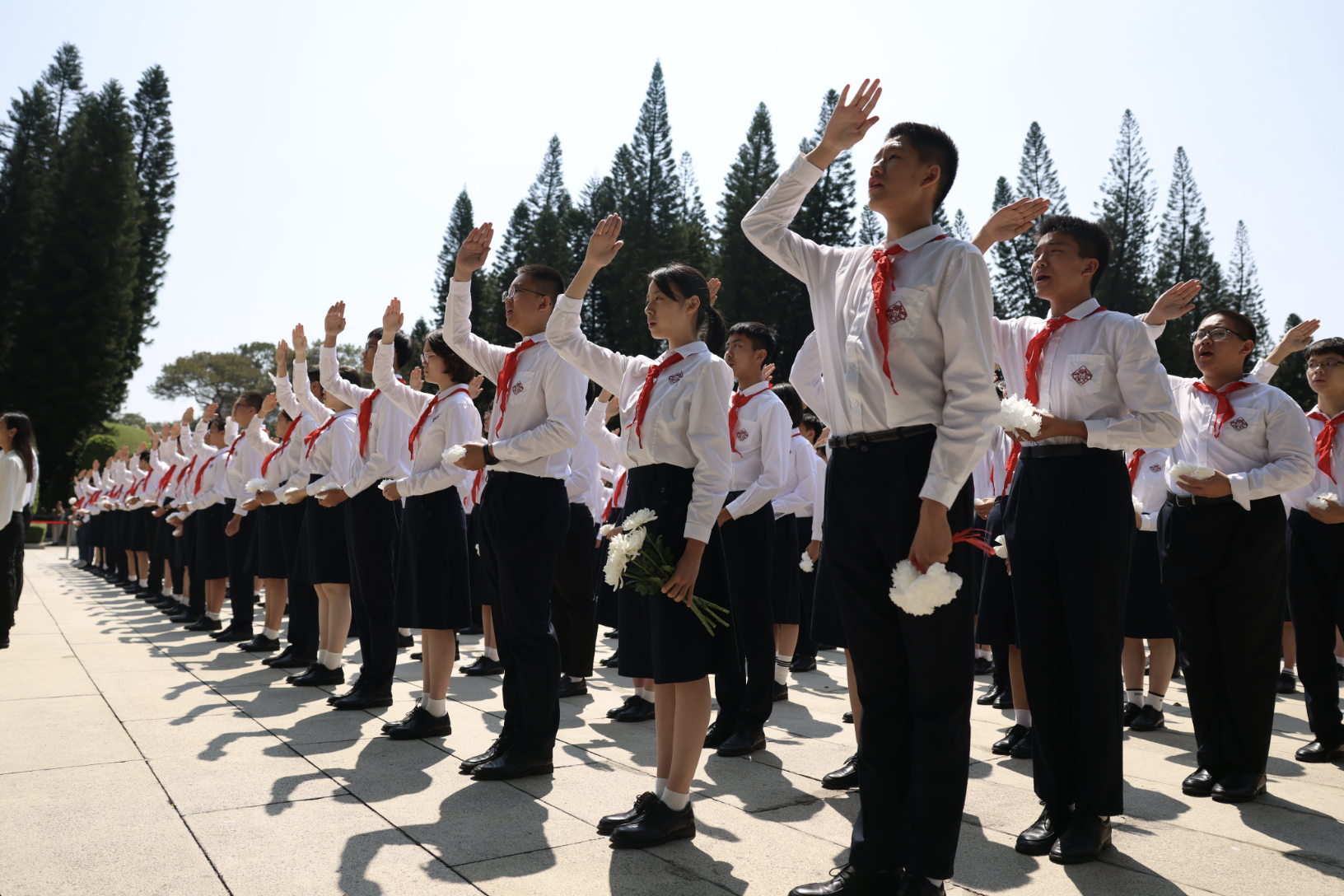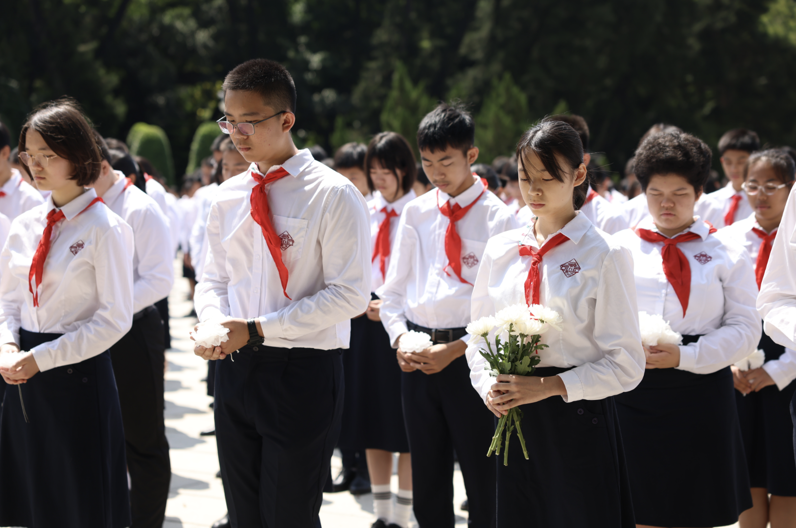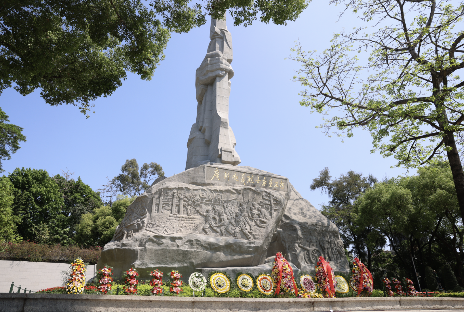 随后,来自广州市执信中学、越秀区东川路小学的学生代表依序上前,将手中承载着敬意的小白花摆放在纪念碑前,现场全体人员绕行瞻仰纪念碑,表达对革命先烈的无限敬意。